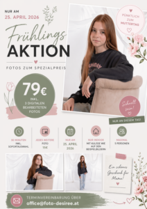 Gutscheine von Foto Desiree sind zeitlich unbegrenzt und auf alle Dienstleistungen einlösbar. Zur Auswahl stehen viele feste Beträge oder auch ein Wunschbetrag. Der Gutschein kann nach dem Kauf einfach heruntergeladen werden oder auch per Post zugesendet werden.